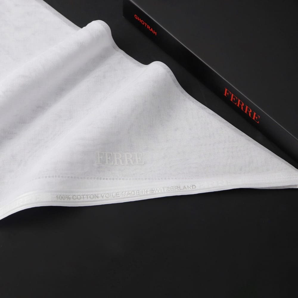 غترة بيضاء صناعة سويسرية ماركة فيري، مميزة بالقطن الطبيعي الخالص، منسوجة بخيوط متماسكة ولون أبيض يعكس جمال الغترة، جودة عالية ناعمة وخفيفة لتكون مثالية بالنسبة للمعايير الأوروبية.